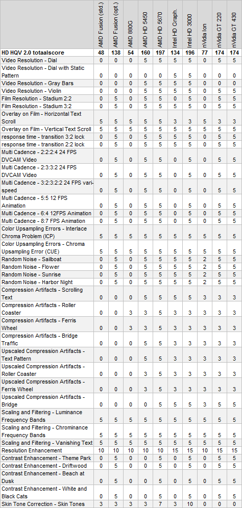 Wat voor effect heeft dit nu uiteindelijk op de HD HQV 2.0 scores, zoals uitvoerig besproken in ons artikel over videokwaliteit van begin februari? Met de standaardinstellingen - ofwel Enforce Smooth Video Playback ingeschakeld - komen we uit op 48 punten voor Fusion. Niet bepaald om over naar huis te schrijven. Door telkens voor de specifieke tests de daarvoor bedoelde opties in de drivers in te schakelen, komen we uit op een maximum score van 138 punten. Prima, maar niet geweldig. Zeker als je bedenkt dat zelfs bij de optimale instelling de deïnterlacing kwaliteit beduidend lager is dan die van andere GPU's.