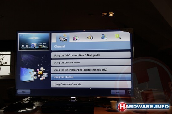 De menu's van de nieuwe televisie hebben ook een opfrisbeurt gekregen en bovendien is de elektronische handleiding vanaf dit jaar in de televisie ingebouwd, en niet langer op USB stick meegeleverd. Handig is hierbij dat het oproepen van de handleiding contextgevoelig werkt. Roep je de handleiding op vanuit het menu voor beeldinstellingen, dan zal de handleiding automatisch bij het corresponderende onderwerp openen.