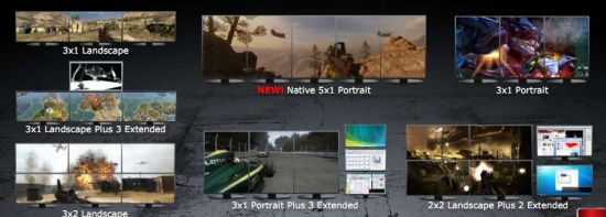Laten we niet vergeten: een kaart met de rekenkracht van de Radeon HD 6990 is natuurlijk in de basis gemaakt voor gebruik op meerdere schermen. In onderstaande afbeelding zie je een aantal voorbeeldconfiguraties van Eyefinity opstellingen die met de nieuwe kaart mogelijk zijn. Volgens AMD is de nieuwe kaart krachtig genoeg om alle moderne games op de resolutie van drie 30" schermen (7680x1600) vloeiend weer te geven.