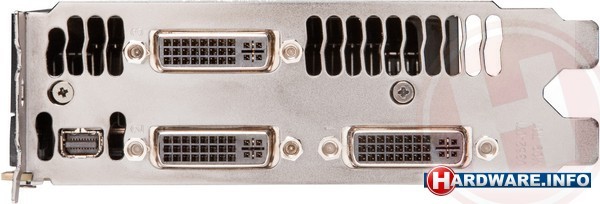 Aan de voorkant vinden we drie DVI-aansluitingen en één Mini-DisplayPort. Aangezien we hier van doen hebben met twee GPU's op één kaart, kan de GeForce GTX 590 vier monitoren tegelijkertijd aansturen. De steeds populairder wordende gaming opstellingen met drie schermen kun je dus sowieso ook gebruiken met één GTX 590.