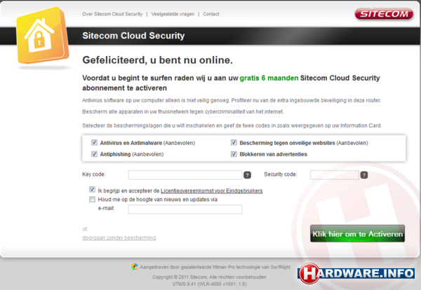 Eenmaal online is de cloud security te activeren middels de meegeleverde code. Vervolgens is ook aan te vinken welke onderdelen je wel en niet geactiveerd wilt hebben.