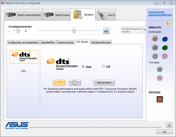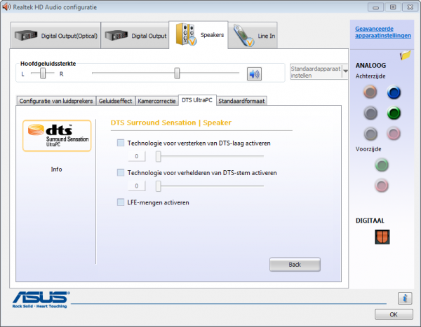 Voor deze test hebben we gebruik gemaakt van het Asus P7H57D-V Evo moederbord met een Realtek ALC889 geluidschip. De werking van dit pakket is een stuk lastiger te doorgronden dan de andere in deze test. Om DTS Surround Sensation UltraPC te activeren moet je altijd het surround-effect inschakelen. Je kunt DTS Voice Clarity en Bass enhancement dus niet los gebruiken. Voice Clarity wordt gebruikt om stemmen helderder te maken in films en muziek. Dit werkt redelijk goed in films, maar geeft een wat hol effect, waardoor de stemkwaliteit achteruitgaat. Muziek klinkt met deze optie doffer en het stemgeluid wordt helaas ook niet duidelijker verstaanbaar. Bass Enhancement werkt minder goed dan de toepassing van Dolby. De midden en hoge tonen worden met deze optie ook beïnvloed, waardoor je het beter niet kunt gebruiken. De surround-implementatie in films werkt wel goed en maakt het geluid mooier en een deels ruimtelijker. Het is alleen jammer dat dit pakket een surround-speakerset niet ondersteunt; het schakelt dan alles uit, dus ook Voice Clarity en Bass Enhancement. Een extra toevoeging is LFE mixing; deze Low Frequency Effects instelling zorgt voor een 10dB boost in het baskanaal voor media dat in DTS-surround is gecodeerd. Concluderend kunnen we zeggen dat dit pakket veel belooft, maar te veel tekortkomingen heeft. Het is volgens ons dan ook geen aanrader.