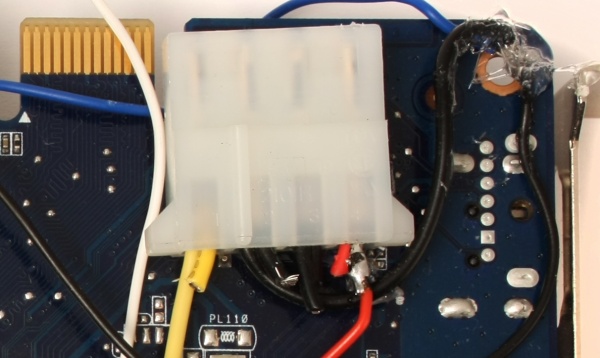 Voor het plaatsen van readouts bestaan verschillende manieren. Wij doen het in dit geval met een afgeknipte female molex connector. Met een dot hete lijm kun je deze op een (bij voorkeur leeg) plekje op de kaart plakken. De twee middelste, ofwel zwarte draden van de molexconnector kun je aan een ground solderen. De gele of de rode draad verbind je met het meetpunt. Bij het gebruik van een GPU- én geheugenmodificatie heb je ze dus allebei nodig, als je maar één van de twee gaat doen kun je ervoor kiezen om de niet gebruikte draad af te knippen.