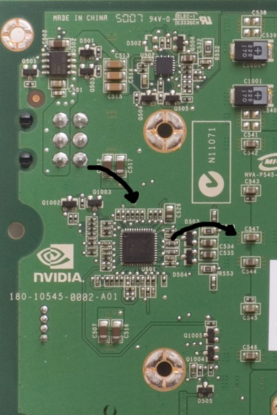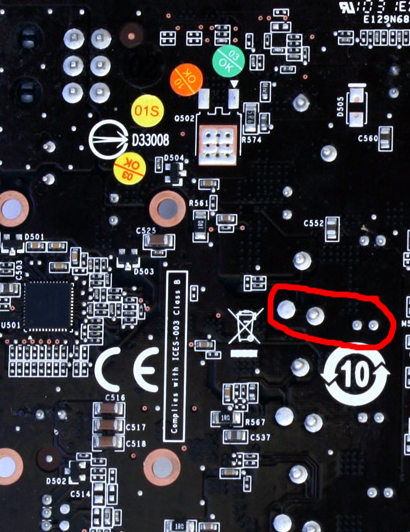 Van de voltages Vgpu en Vmem, is Vgpu meestal het makkelijkst te vinden. Om te zoeken waar we moeten gaan meten, leg je de videokaart altijd met de achterkant naar boven. Op de achterkant, waar je de schroeven van je koeler ook kan vinden, zit in 99% van de gevallen het uitleespunt van het voltage dat je wilt meten. Heb je een videokaart met extra stroomconnector zoals een PEG 6-pins, ga dan van links naar rechts om te zoeken. Vlakbij de PEG, meestal eronder, zit de IC die je verderop nodig hebt voor je voltmod. Vanaf die IC kunnen we verder zoeken naar een leespunt. Dit is vaak een klein beetje meer naar rechts voordat je een rij met SMD condensators of Hi-c caps tegenkomt, vaak in het aantal fasen dat de videokaart heeft. Als je dit herkent, kan elk van deze condensators als uitleespunt dienen.