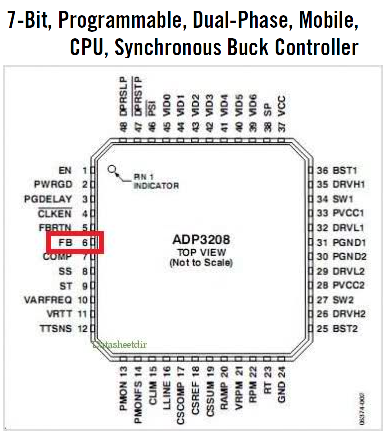 Ook belangrijk is dat het IC dat je opgezocht hebt een zogenaamde "FB pin" heeft. De weerstand aangesloten op deze pin bepaalt welk voltage uiteindelijk door de controllerchip ingesteld wordt. Doordat we de weerstand gaan veranderen, gaat het voltage omhoog. Zoals je in onderstaand voorbeeld duidelijk kan zien, zit er op pin 6 de FB. Bij het uitvoeren van de voltmod gaan wij hier solderen.