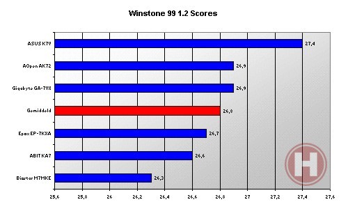 Laten we eerst naar de Winstone 99 scores kijken. Onderstaande grafiek toont de resultaten bij de verschillende moederborden.