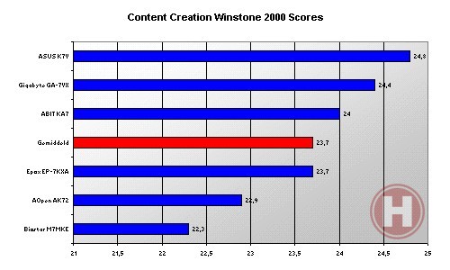 Hier ook weer een voorsprong voor de ASUS K7V. Zowel het AOpen als het Biostar moederbord blijven een beetje achter bij de rest.