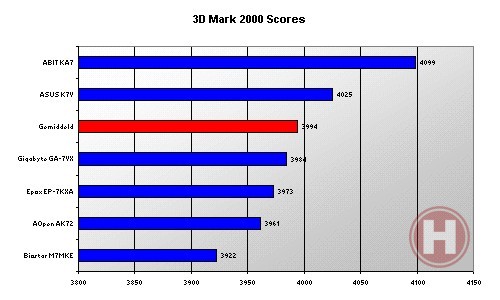 De ABIT KA7 presteert in 3D Mark 2000 absoluut het beste, hoewel ASUS nog steeds een goede tweede is. De scores van de andere moederborden verschillen niet zoveel, hoewel Biostar helaas weer op de laatste plaats terecht komt.