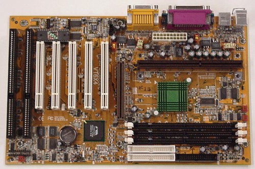 Voor de VT6X4 heeft ABIT gekozen voor een Slot 1 uitvoering. Naast een AGP slot en 5 PCI sloten vinden op de VT6X4 nog twee ISA sloten terug. Dit is uniek, want alle andere moederborden in deze test hebben slechts één ISA slot. Hoewel ISA al lang ‘uitgestorven’ is, kan een tweede ISA slot voor mensen met oude uitbreidingskaarten een ideale oplossing zijn. Een AMR slot moeten we op de VT6X4 missen. De lay-out van het bord is in één woord perfect: alles zit op de juiste plaats. Het valt op dat ABIT goed aan overklokkers heeft gedacht, want er zijn geen condensatoren die een grote koeler in de weg kunnen zitten en ook de voedingsconnector is op een mooie manier weggewerkt.