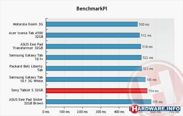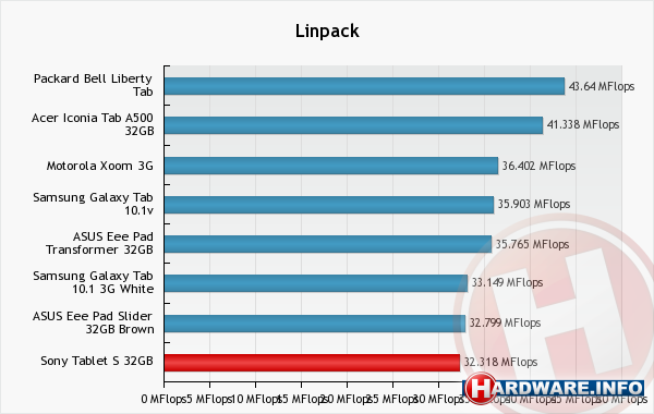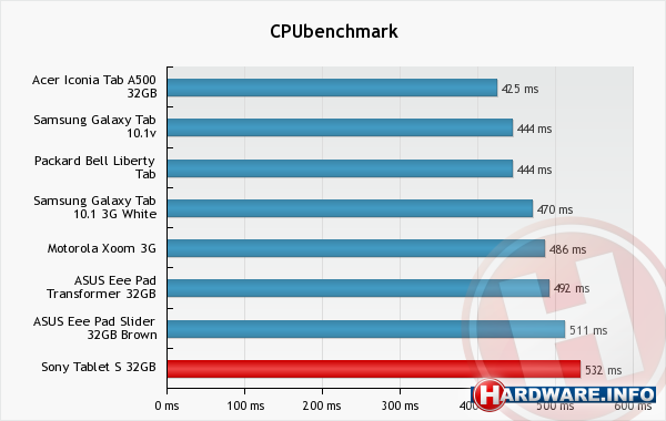 De Sony Tablet S vertoont bij de CPU-benchmarks hetzelfde gedrag als de ASUS Eee Pad Slider en de Samsung Galaxy Tab 10.1, de twee andere tablets in de lijst die ten tijde van de test Android 3.1 als besturingssysteem hadden. Zoals al vastgesteld in de reviews van die tablets, haalt een tablet met Android 3.1 (of 3.2) als besturingssysteem lagere scores bij de CPU-benchmarks dan tablets die Android 3.0 draaien, terwijl de scores bij de GPU-benchmarks juist weer hoger zijn.