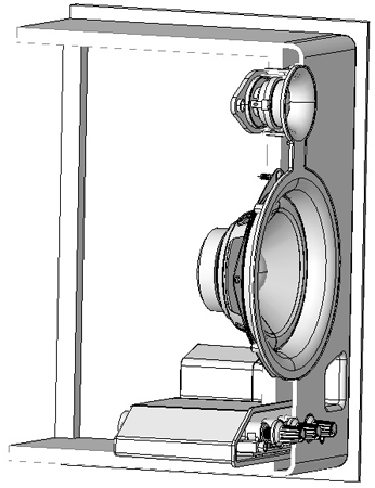 In onderstaande afbeelding is een schematische dwarsdoorsnede van de rechterspeaker te zien. Zichtbaar zijn de afgeschermde versterkermodule en de extra plastic laag aan de voorzijde.