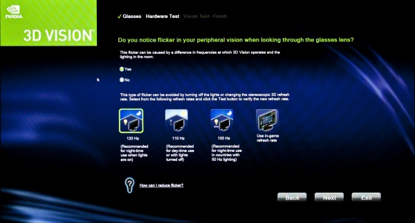Beide monitoren zijn uiteraard voorzien van een 120Hz paneel om snel tussen de 3D beelden voor het linker- en rechteroog te kunnen wisselen. De frequentie van de stroomvoorziening in Nederland is echter 50 Hz, wat ervoor zorgt dat de combinatie van de shutter-bril (waarvan de glazen met een frequentie van 60Hz openen en sluiten) en de TL-verlichting het licht in de omgeving doen flikkeren. nVidia geeft je de mogelijkheid om in het controlepaneel de frequentie in te stellen op 110 of 100 Hz om zo de flikkering waar mogelijk te voorkomen. Bij ons zorgde dit ervoor dat de TL-verlichting weer rustig werd, maar door de verlaging van de verversingssnelheid werd het beeld helaas wel onrustiger en minder prettig voor het oog.