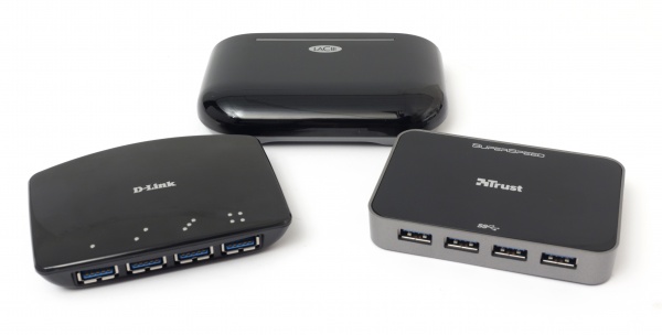 Inmiddels zijn er ook al de nodige USB 3.0-hubs op de markt, kastjes die één USB 3.0-aansluiting omzetten naar vier stuks. Voor dit artikel gingen we aan de slag met exemplaren van LaCie (gemiddeld 44 euro), D-Link (gemiddeld 55 euro) en Trust (gemiddeld 40 euro). Bij nadere inspectie blijken alle drie de exemplaren gebaseerd op dezelfde chip, de VIA VL810. Diezelfde chip werd ook al door een aantal moederbordenfabrikanten – voornamelijk Gigabyte – gebruikt om het aantal USB 3.0-poorten op een moederbord eenvoudig te verhogen. Destijds concludeerden we dat we niet heel erg gecharmeerd waren van zo’n implementatie met hubs op moederborden: vier poorten delen immers de bandbreedte van één.
