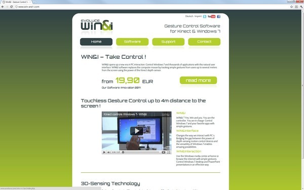 Voorbeelden zijn het gratis programma KinEmote (op moment van schrijven in versie 0.4) en de betaalde variant Win&I. Deze laatste probeerden we uit. Win&I is gebaseerd op het OpenNI framework. Na betaling van 19,90 euro (39,90 voor de zakelijke versie) ontvang je de drie componenten van deze API en het installatiebestand van Win&I. De software werkt weliswaar, maar daar is het ook wel mee gezegd. Een van de minpunten van de Kinect is een kleine vertraging tussen waarneming en doorsturen van een commando. Wanneer een toepassing goed geprogrammeerd is, merk je daar weinig van, maar bij Win&I is die vertraging nog té zeer aanwezig, waardoor het lastig is commando’s op het juiste moment door te geven. Ook zijn de gekozen bewegingen niet heel intuïtief, zo zou een beweging naar links voor de linkermuistoets niet onze eerste keuze zijn. De ontwikkelaar van Win&I wees ons wel op de mogelijkheid de gevoeligheid aan te passen door het configuratiebestand te wijzigen; versie 2.0 moet ondersteuning bieden aan aansturing met twee armen/handen tegelijk, waarmee de ‘Minority Report’-ervaring weer een stap dichterbij de realiteit komt. Op de website van de fabrikant is een filmpje te zien, waarmee je een goede indruk krijgt van hoe het werkt: met wat oefening heel aardig, maar een echt ontspannen vorm van bediening is het nog niet.