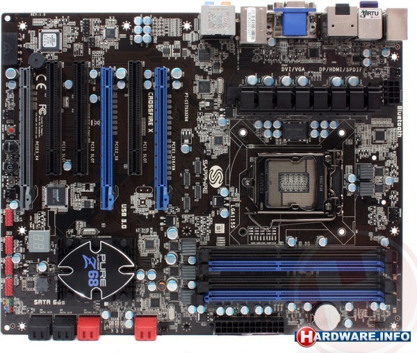Het bord biedt drie PCI-Express x16 sloten (16/0/4 of 8/8/4), maar heeft geen ondersteuning voor SLI, aangezien Sapphire en nVidia niet bepaald elkaars beste vrienden zijn. Intern vinden we acht Serial ATA-aansluitingen, eSATA is er niet. Voor de in de processor geïntegreerde videokaart zijn alle vier de typen monitoraansluitingen geïmplementeerd. Het bord heeft alleen extern 2x usb 3.0, er is helaas geen interne aansluiting. Voor audio wordt de ALC892 gebruikt en al extraatje biedt Sapphire Bluetooth.