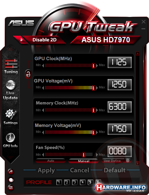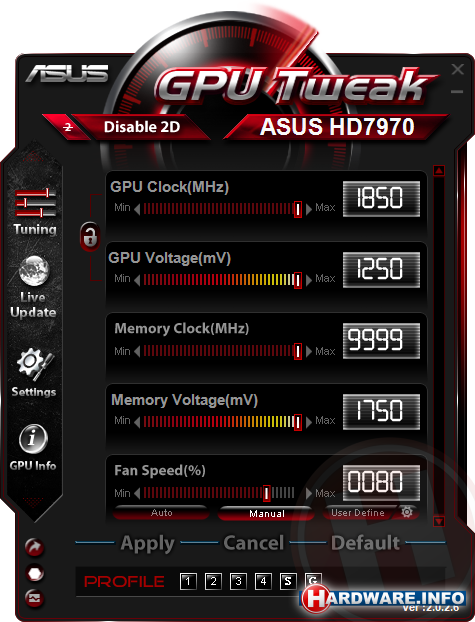 Voor het daadwerkelijk overklokken van de Radeon HD 7970 kaarten maakten we gebruik van de ASUS GPU Tweak software. Hoewel deze software door ASUS is uitgebracht, werkt deze ook prima op videokaarten van andere merken, zij het dat de functionaliteit dan beperkt blijft tot het aanpassen van klokfrequenties. Zoals op de volgende pagina te lezen, is die beperking relatief makkelijk te omzeilen.