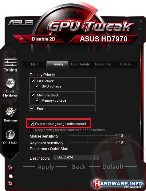Standaard zijn de maximaal instelbare klokfrequenties in GPU Tweak net als in Catalyst Control Center redelijk conservatief. Gelukkig is de grens eenvoudig te verhogen. Klik op Settings, ga naar het tabblad Tuning en zet hier een vinkje voor Overclocking range enhancement. Je hebt nu flink hogere klokfrequenties tot je beschikking.