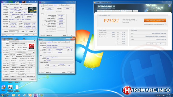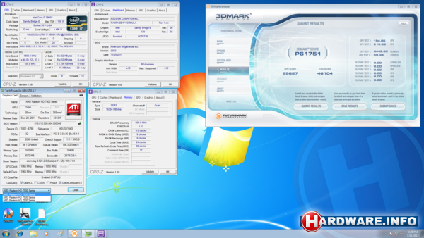 Ten slotte triple-Crossfire. Het overklokpotentieel van de videokaarten neemt vanwege de niet optimale koeling van een dergelijke opstelling wat verder af. Wij kwamen tot 1095 MHz voor de GPU-klokfrequenties en 1550 MHz voor het geheugen. Dat alles resulteerde in 61751 punten in 3DMark Vantage en 23422 punten in 3DMark11. De resultaten vind je in dit user systeem.