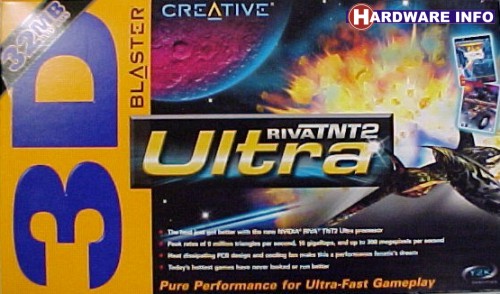 De eerste UltraTNT2 videokaart die terecht gekomen is in het Hardwareinfo.net test systeem is de Creative 3D Blaster UltraTNT2. Creative heeft de standaard TNT2 videokaart alweer een beetje uitgefaseerd en dus vinden we bij de meeste Creative retailers alleen deze kaart in de schappen, naast hun (veel) goedkopere 3D Blaster Savage 4. Zoals we al hebben kunnen lezen in het TNT2 Preview Artikel zijn er van de RivaTNT2 chip twee uitvoering: de standaard TNT2 (zoals we die al tegenkwamen op de Leadtek S320II en de ASUS V3800TVR) en deze UltraTNT2 chip. Het grote verschil tussen beide is de kloksnelheden waarmee beiden werken. De standaard TNT2 kaarten werken vrijwel allemaal met een 125 MHz chip klokfrequentie en een 150 MHz geheugen klokfrequentie. De UltraTNT2 kaarten, waaronder deze Creative, doen hier een schepje bovenop met 150 MHz voor de chip en 183 MHz voor het geheugen. Qua functionaliteit is er geen verschil tussen de TNT2 en de UltraTNT2, dus we zullen de voordelen van deze kaart echt in de snelheid moeten zoeken. Daarom zullen we in de benchmark grafieken naast de score van deze kaart ook de scores van de Leadtek S320II standaard TNT2 kaart plaatsen, om zo een goed beeld te krijgen van de voordelen van de UltraTNT2 kaarten.
