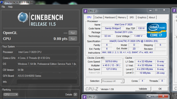 Op 5171 MHz bleek de processor niet stabiel genoeg om daadwerkelijk benchmarks uit te voeren. Dat lukt ons wel op 5080 MHz (multiplier 40x, baseclock multiplier 1,25x en baseclock 101,6 MHz). Dit resulteerde in een Cinebench 11.5 score van 9,89 punten. Wie even terugbladert naar pagina 13, ziet dat die score zo'n 33% sneller is dan de standaard score van 7,4 punten, maar dat de 6-core Core i7-varianten duidelijk buiten schot blijven.