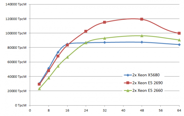 Het vorige generatie Xeon-platform stopt met schalen bij 16 gelijktijdige transacties en behaalt nipt de beste score bij concurrency 48: 87.453 transacties per minuut. De server met twee Xeon E5 2690 processors blijft schalen tot concurrency 48 en komt daar uit op 119.187 transacties per minuut: 36% betere prestaties dus. Vanaf concurrency 64 zakken de prestaties wel weer een beetje in. De zuinigere opstelling met twee Xeon E5 2660 processors en de Samsung LRDIMMS valt er tussenin en piekt op 96.418 transacties per minuut.