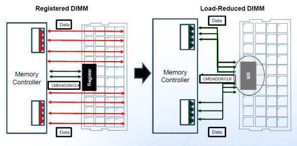 Bij LRDIMMs loopt alle communicatie via een soort repeaterchip op de geheugenmodule. Voordeel: lager stroomverbruik en hogere capaciteiten.