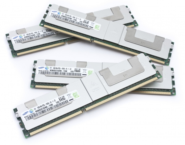 Voor wie nog meer geheugen nodig heeft en/of wie het stroomverbruik van servers verder wil terugbrengen, heeft Intel in samenwerking met onder meer Samsung een nieuw type DIMMs ontikkeld: LRDIMMs, wat staat voor Load Reduced DIMMs. Bij dergelijke geheugenmodules spreekt de geheugencontroller in de processor niet de geheugenchips rechtstreeks aan, maar loopt alle adressering en datacommunicatie via een repeater-chip op de geheugenmodule. Voordeel is dat de geheugencontroller minder stroom hoeft te leveren en dat er eenvoudiger DIMMs met een hogere capaciteit kunnen worden toegepast. Samsung heeft bijvoorbeeld als LRDIMMs met een capaciteit van 32 GB aangekondigd. Met drie per kanaal zou je zo 768 GB geheugen in een Xeon E5-2600 server kunnen plaatsen, nog altijd werkend op DDR3-1333 snelheid. Verderop in dit artikel lees je onze bevindingen met Samsung LRDIMMs met een capaciteit van 16 GB per stuk.