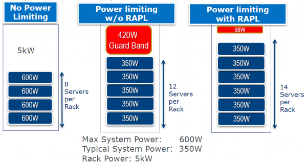 Onderstaande afbeelding illusteert dat met een voorbeeld. Stel dat er in een datacenter een maximum is van 5 kW stroomvoorziening per rek. Meer stroom kan er simpelweg niet geleverd worden. Ook als je servers gemiddeld 350 watt verbruiken, zorgen mogelijke pieken tot 600 watt ervoor dat je feitelijk slechts 8 servers in het rek kan plaatsen om 100% zeker te zijn dat er nooit problemen zullen onstaan. Met traditionele implementaties van power limieten voor een rek servers kun je wel meer servers plaatsen, maar moet er een grote veiligsheidsmarge worden bewaard. Dankzij RAPL kunnen processors intern en onderling sneller anticiperen en zouden in hetzelfde rek volgens Intels voorbeeld 14 servers geplaatst kunnen worden.