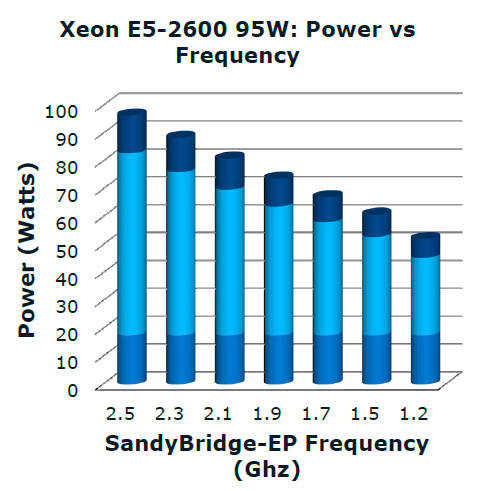 In de nieuwe Xeon E5 modellen heeft Intel enkele verregaande aanpassingen in het power management toegepast. Een van die zaken is dat het zogenoemde uncore gedeelte van de processor (ondermeer de L3-cache) nu in hetzelfde frequentie- en voltagedomein zit als de cores zelf. Een voordeel daarvan hadden we al gezien: als de cores dankzij turbo opschalen, doet de L3-cache dat ook. Maar andersom werkt het ook: als de cores in idles modus terugschakelen, gaan ook andere chiponderdelen in zuinigere stand werken. Dat maakt dat de klokfrequentie-stroomverbruik schaling een stuk steiler is geworden, zoals ook te zien in onderstaande afbeelding.
