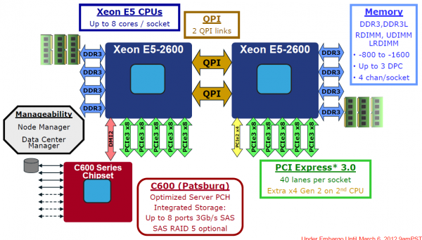 Processor en chipset staan met elkaar in verbinding via een DMI2 verbinding, wat in principe PCI-Express 2.0 x4 is. De combinatie van twee Xeon E5-2600 processors met een C600 chipset noemt Intel het Romley platform. Onderstaande afbeelding laat zien hoe het totaalplaatje er uit ziet.