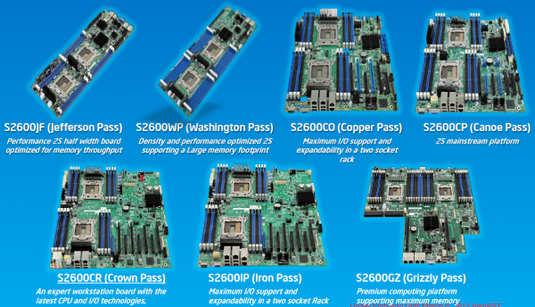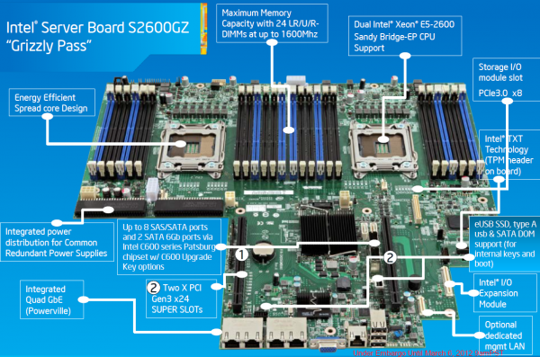 De servermoederbordentak van Intel heeft diverse dual-Socket 2011 borden klaar voor het nieuwe platform, gericht op verschillende gebruiksdoelen. Zo is het S2600IP (Iron Pass) moederbord ontwikkeld om zoveel mogelijk I/O-poorten te bieden, terwijl de S2600CR (Crown Pass) juist gericht is op workstations. De server die wij gebruikten om de prestaties van het nieuwe platform te analyseren is gebaseerd op het S2600GZ (Grizzly Pass) bord, dat speciaal ontwikkeld is voor goed gebruik in 2U-server en het maximale aantal van 24 DIMM-slots biedt.
