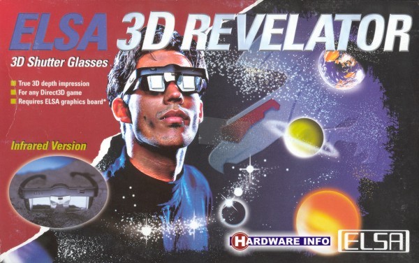 Een tijdje geleden hebben we uitgebreid aandacht besteed aan ELSA's TNT2 videokaart, de Erazor III. In dit artikel behandelen we de bijbehorende 3D bril. Net als ASUS heeft ook ELSA een 3D bril in haar assortiment, om zo bezitters van een ELSA videokaart hun 3D games nog realistischer te laten beleven. De 3D Revelator is er in twee uitvoeringen: de goedkoopste (ca. Fl. 150,--) wordt via een kabel aangesloten op de PC. De iets duurdere uitvoering (ca. Fl. 200,--) werkt via Infrarood. Een dergelijke variant ontvingen wij ook voor de test.