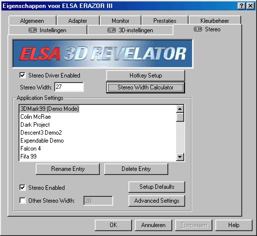Het installeren op de Erazor III ging in eerste instantie helemaal niet. (Vandaar dat het ook even geduurd heeft eer deze review online staat.) Na een telefoontje met de distributeur bleek dat ik nog een oude driver-cd meegeleverd had gekregen, met daarop nog geen ondersteuning voor de Erazor III. Meteen een dag na het telefoontje lag er gelukkig een nieuwe CD op de stoep, waarmee de bril in één keer goed geïnstalleerd kon worden. Na de installatie komt er bij de ELSA tabbladen in de beeldscherm eigenschappen een extra blad voor de 3D bril bij:
