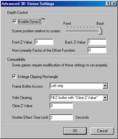 Ik heb de bril voornamelijk getest met de Direct3D versie van het spel Unreal. De bril functioneerde meteen, maar het beeld leek nog wat te flikkeren. Met een bepaalde toetsen-combinatie kan echter binnen het spel onderstaand instellingspaneel van de bril worden opgeroepen, waarin de brilinstellingen nauwkeurig kunnen worden geconfigureerd: