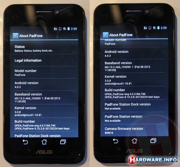 De Padfones die ASUS op het MWC toonde waren voorzien van een licht aangepaste versie van Android 4.0.3, maar omdat het sowieso nog enkele maanden duurt voordat het apparaat op de markt verschijnt, kan hier mogelijk nog het nodige aan veranderen. Met de huidige software blijkt de Padfone snel op input te reageren en lijkt de basisfunctionaliteit uitstekend te werken. Benchmarks of uitgebreide tests hebben we niet kunnen draaien, meer hierover dus in onze uiteindelijke review.