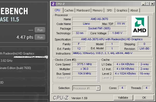 Cinebench 11.5 konden we stabiel draaien op een klokfrequentie van 3775 MHz, resulterend in een score van 4,47 punten. Standaard komt de processor op 3,26 punten.