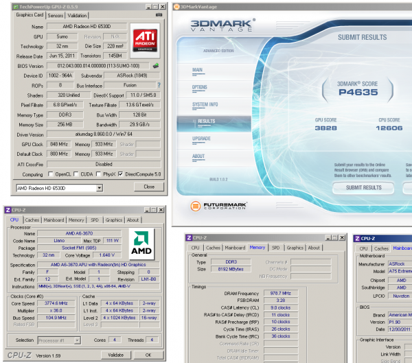 De GPU binnen de A6 had opvallend genoeg flink meer speelruimte dan die van de A8. De 320 cores konden we laten werken op 848 MHz. Samen met een op 3775 MHz geklokt CPU-gedeelte kwamen we zo uit op een 3DMark Vantage score van 4635 punten. Flink meer dan de stock score van 3271 punten en zeker veel meer dan Intels score in dit prijssegment van circa 1000 punten.