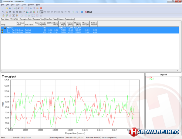 We testen zowel de bekabelde als de draadloze snelheden van de routers. Dit doen we aan de hand van het IxChariot-pakket van Ixia, een veelgebruikt pakket in de routerwereld voor het meten van doorvoersnelheden in een netwerk. Op alle systemen in het testnetwerk installeren we een zogenaamd endpoint, waarna de software aan de hand van een testscript bepaalt hoeveel megabits er per seconde van het ene endpoint naar het andere gestuurd kunnen worden. We meten de bekabelde snelheid van WAN naar LAN en van LAN naar LAN; dit houdt in dat er pakketjes vanaf een systeem gestuurd worden en via de WAN-poort op de router door een LAN-poort aan een ander systeem doorgegeven worden. Bij LAN naar LAN zijn beide systemen logischerwijs aangesloten op twee LAN-poorten.
