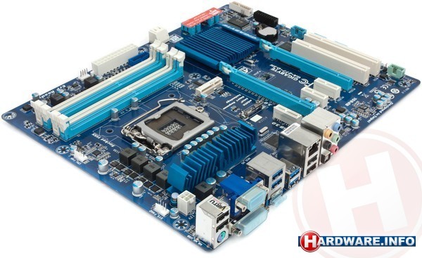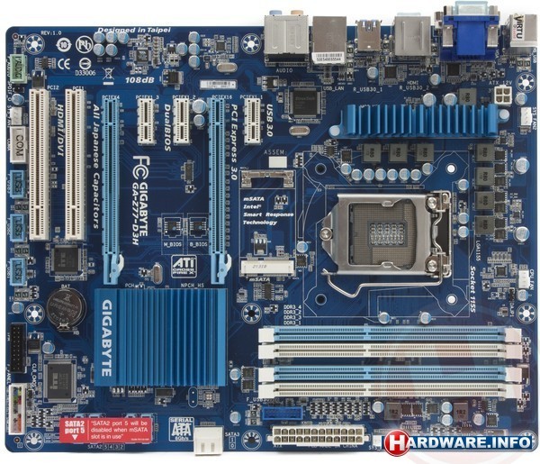 De GA-Z77-D3H biedt verder twee PCI-Express x16 sloten, drie maal PCI-Express x1 en twee maal PCI. Er zijn intern zes SATA-poorten, eSATA ontbreekt. USB 3.0 is er zes keer, waarvan vier keer extern. Voor de twee extra USB 3.0 poorten gebruikt Gigabyte een EtronTech chip. Er zijn VGA, DVI en HDMI monitoruitgangen en ook bij dit bord bundelt Gigabyte de Virtu MVP software om de geïntegreerde GPU de prestaties van een optioneel los exemplaar te laten verbeteren. Net als bij de op de vorige pagina beschreven Micro ATX borden, gebruikt Gigabyte op dit bord een VIA VT2021 audiochip. Op de PCB staat de term '108 dB' geprint, vermoedelijk uit macht der gewoonte toen Gigabyte nog in alle prijsklassen de luxe Realtek ALC889 codecs gebruikte. Met de VIA wordt een dergelijke geluidskwaliteit bij lange na niet gehaald. De netwerkchip komt van Atheros en dat is opvallend: deze fabrikant kennen we voornamelijk van WLAN-controllers.