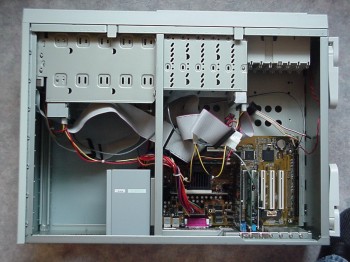 Opvallend is dat het moederbord door twee schroefjes los te draaien aan de achterzijde van de kast te verwijderen is. Hiervoor moet natuurlijk wel geen bekabeling op het moederbord aangesloten zitten.