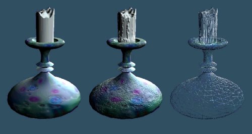 De meeste linkse kandelaar is belicht met per-pixel diffuse lightning en per-pixel specular lightning. Bij de tweede kandelaar is echter nog gebruik gemaakt van de speciaal gemaakte normal map en het per-pixel bump mapping systeem. We zien prachtige reliëf effecten op de kandelaar, maar de 3D opbouw van de kandelaar is niet gewijzigd.