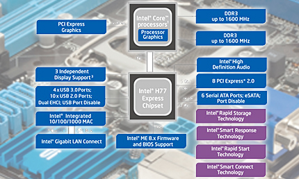 De overige features zijn identiek. De chipset biedt onder meer 2x Serial ATA 600, 4x Serial ATA 300, 4x USB 3.0, 10x USB 2.0, RAID-functionaliteit, SSD-caching en de mogelijkheid om maximaal drie schermen aan te sturen. Onderstaand schema, dat we ook al in de Z77 test publiceerden, toont de volledige lijst eigenschappen van de H77 in vergelijking met andere Ivy Bridge moederborden.
