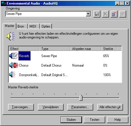 In de screenshot kunnen we bijvoorbeeld zien hoe het effect "sewer pipe" wordt opgebouwd. De reverb enige wordt voor 65% geactiveerd terwijl de chorus gewoon op normaal blijft staan. De sewer pipe biedt verder geen demping van het originele geluid.