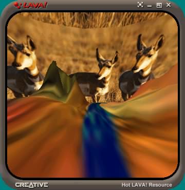 Rechts vinden we twee extra knoppen. De eerste is om Environmental Audio effecten op de afgespeelde muziek toe te passen. De tweede is voor het nieuwe LAVA! (Live! Audio Visual Animation) systeem, dat real-time 3D animaties kan vertonen bij verschillende geluidsbronnen. Onderstaande afbeelding toont een screenshot van het LAVA! systeem.