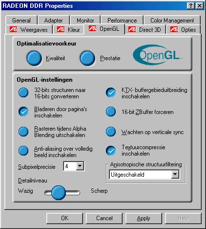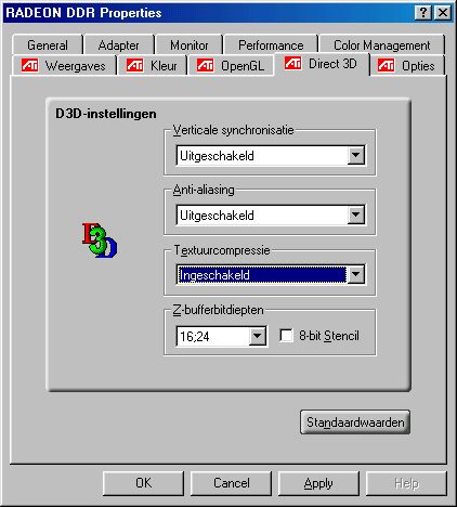 Onderstaande screenshots geven een beeld van de drivers die ATI bij de Radeon meelevert. Zoals te zien is alles lekker uitgebreid en kunnen veel zaken ingesteld worden.