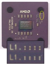 Om de multiplier van een Socket A CPU (AMD Duron of AMD Athlon ‘Thunderbird’) te wijzigen moeten deze ‘unlocked’ zijn. Het is heel makkelijk om na te gaan of jouw Socket A processor wel of niet unlocked is. Op de processor zie je bij de aanduiding ‘L1’ vier bruggetjes. Als deze gesloten zijn is de processor unlocked en kun je probleemloos de multiplier wijzigen met behulp van het ABIT of ASUS moederbord. Als deze bruggetjes echter open zijn, moet je eerst zelf even je processor unlocken. De makkelijkste methode is om met een HB potlood vier lijntjes te trekken tussen bij de vier L1 bruggetjes. Het potloodspul fungeert als geleider en sluit op deze manier de vier bruggetjes. De processor is nu klaar om overklokt te worden! De foto laat dat goed zien: de bovenste L1 bruggetjes van de inzet zijn open, de onderste zijn gesloten.