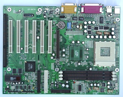 Het Socket A moederbord van Epox heeft de naam EP-8KTA meegekregen. Ook hier een goed gevuld moederbord: