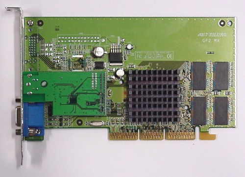 De ABIT kaart maakt gebruik van Hyundai geheugenmodules met een toegangstijd van 6 ns. Onder het extra stukje PCB is een S-Video TV-output verstopt. De GeForce 2 MX chip zelf neemt plaats onder een stevig koelblok.