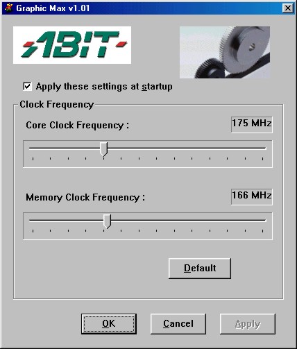 ABIT zou ABIT niet zijn als er geen overklok utility wordt meegeleverd. Zoals we in de Hercules 3D Prophet II MX review hebben kunnen lezen, heeft de GeForce 2 MX als je zelf een koeler toevoegt, heel wat overklok-potentie. ABIT’s Graphic Max programma laat je zonder poespas de klokfrequenties van chip en geheugen aanpassen.