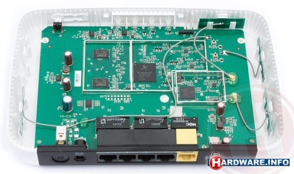 Hieronder zie je het bescheiden bordje van de N600. De CPU is een Atheros AR9344, die tevens zorgt voor het onderhouden van de 2,4GHz-band, terwijl de verbinding op 5 GHz wordt verzorgd door een AR9382. Verder zien we twee 512Mb ESMT RAM-modules zitten, wat neerkomt op een werkgeheugen van 128 MB. Een USB-aansluiting completeert het geheel.